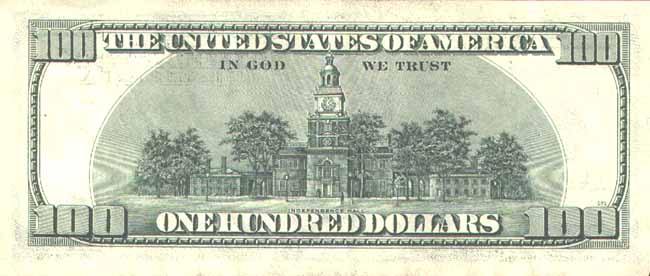 Обратная сторона купюры 100 долларов 1996 года выпуска
