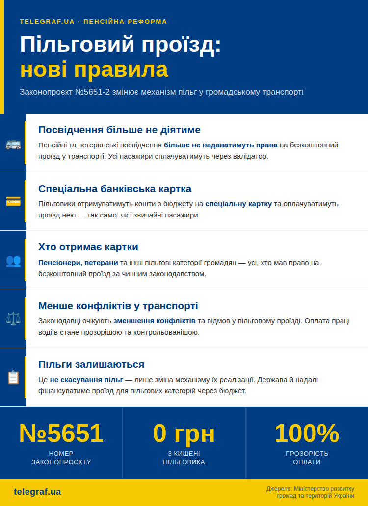 Соответствующий законопроект №5651-2 подготовило Министерство развития общин и территорий. Одним из главных предложений документа является отмена бесплатного проезда: