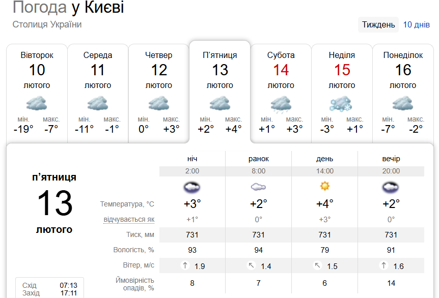 В пятницу, 13 февраля, погода в Киеве будет на уровне предыдущего дня. Минимальная температура ночью — 1 градус мороза, а днем воздух прогреется до +3, без осадков.