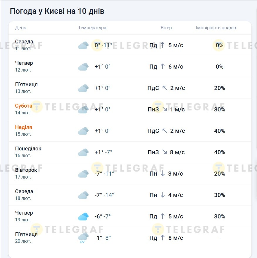 Какая будет погода в Киеве до 20 февраля 2026