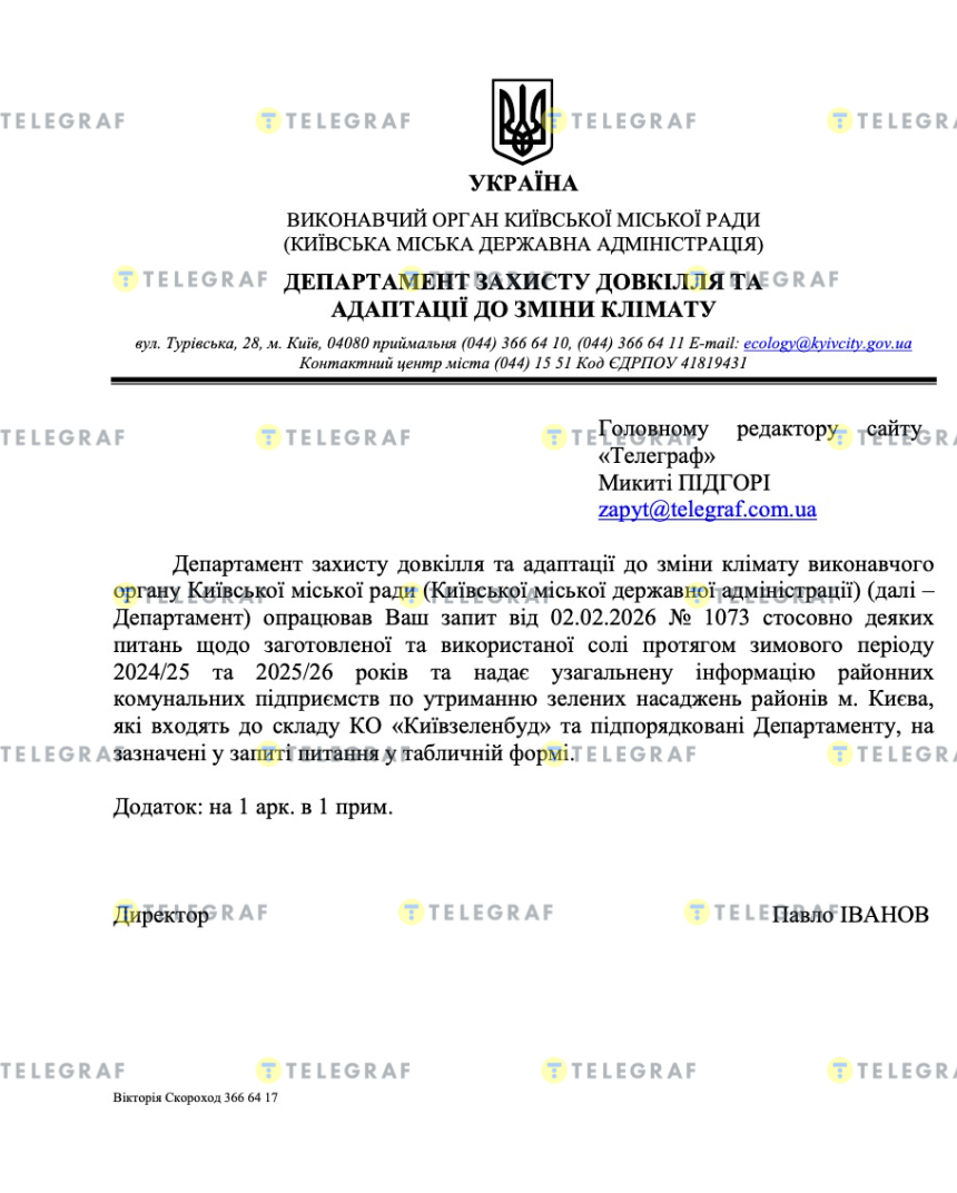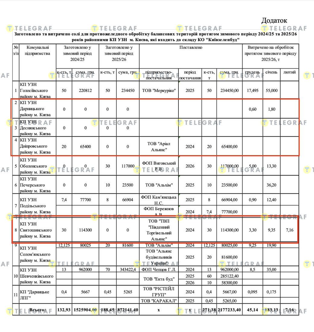 Как выяснил "Телеграф", обратившись в исполнительный орган Киевского городского совета, вопросом закупки соли занимался КО "Киевзеленстрой" и подчиненные Департаменту коммунальные предприятия. Из предоставленного документа следует, что по меньшей мере четыре района не закупали соль для борьбы с гололедом в этом году.