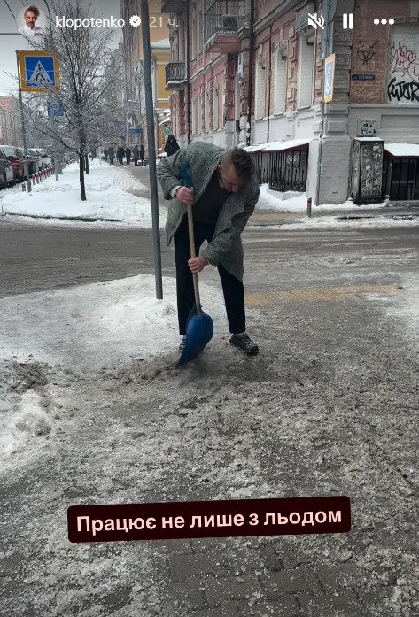 Клопотенко чистит лед на тротуаре в Киеве