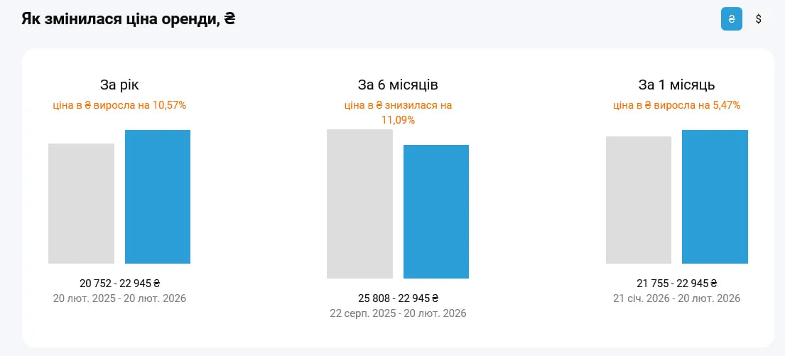 За последние полгода снимать квартиру в Киеве действительно стало заметно выгоднее. Если в августе прошлого года средний чек составлял почти 26 тысяч гривен, то сейчас арендаторы в среднем отдают на 3 тысячи меньше — около 22 945 грн. Падение составило более 11%, что выглядит как праздник для кошелька.