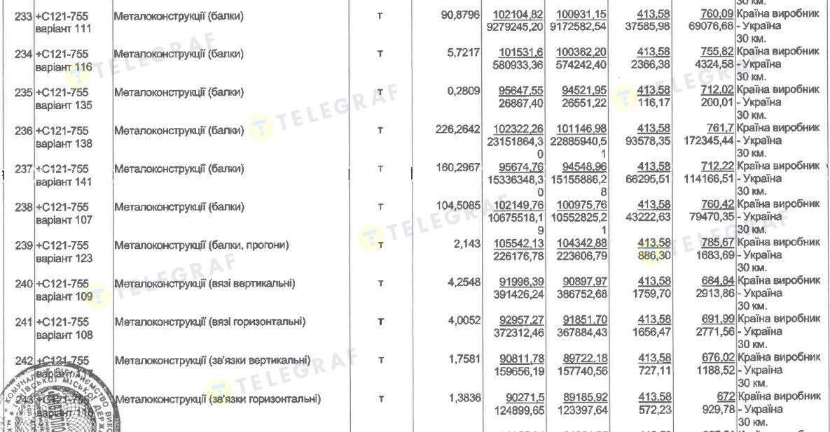 В последнем тендере, например, среди работ по обустройству защитного экрана указан монтаж балок. Цена этого вида металлоконструкций в итоговой ведомости — на уровне 95,6–102,3 тыс. грн. за тонну. Как и в случае с предыдущим подрядчиком, эта цена ориентировочно в два раза выше рыночной, что повлияло на общую стоимость позиций – более 59 млн грн. Таким образом, переплата будет на уровне ориентировочно 10-14 млн. грн. по сравнению с розничными ценами металлобаз.