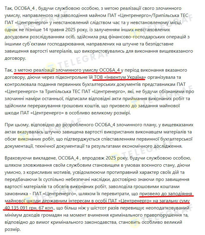 А "свежее" подозрение – в середине января 2026 года — директор ООО "Инвентум Украина" получила из-за злоупотреблений во время восстановления Трипольской ТЭС. Из судебного определения следует: в актах выполненных работ были завышены цены на материалы и объемы работ. В общей сложности это привело к тому, что заказчик — ПАО "Центрэнерго" — переплатил почти 40 млн грн. бюджетных средств