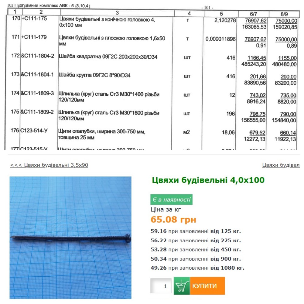 В одном из тендеров на строительство физической защиты когенерационных установок цена за тонну строительных гвоздей с конической головкой 4,0х100 составляет 76 907 тыс. грн., то есть 76,9 грн/кг. В то время как оптовая цена на некоторых сайтах – 65,08 грн/кг, а при закупке от тонны – 49,26 грн/кг. С учетом, что будет подрядчик приобретет более 2 тонн, переплата может быть на уровне 24-58 тыс. грн.