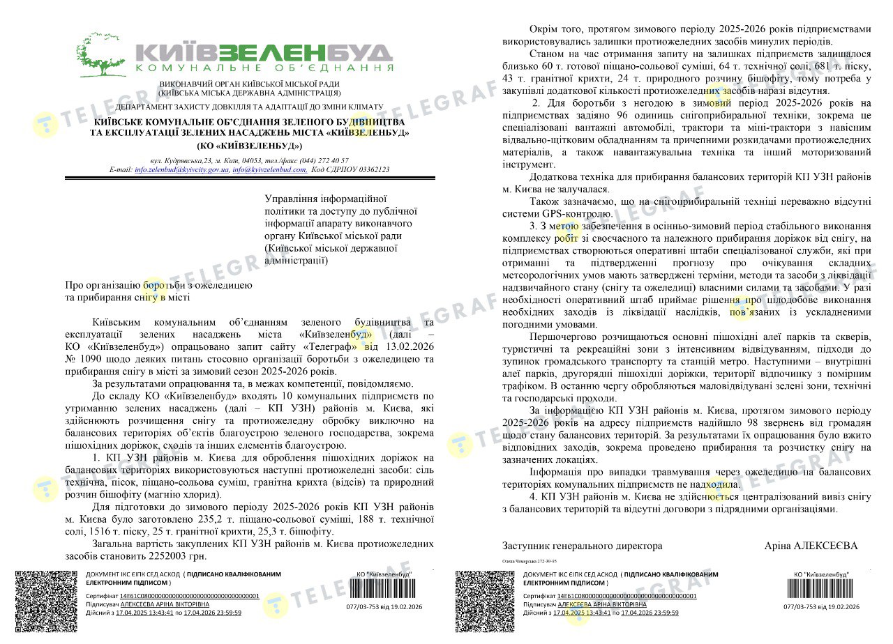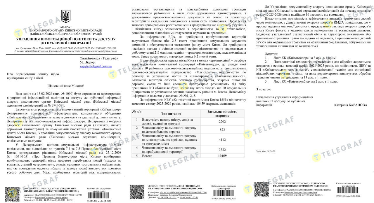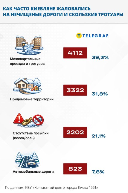 Между тем, киевляне пытались достучаться до власти и КП, сообщая о претензиях к состоянию дорог и тротуаров. За три зимних месяца в "Контактный центр города Киева 1551" поступило 10 459 обращений (т.е. более сотни в день), еще 16 жалоб зафиксировали в управлении документооборота КГГА и 98 — в коммунальном объединении "Зеленстрой".
