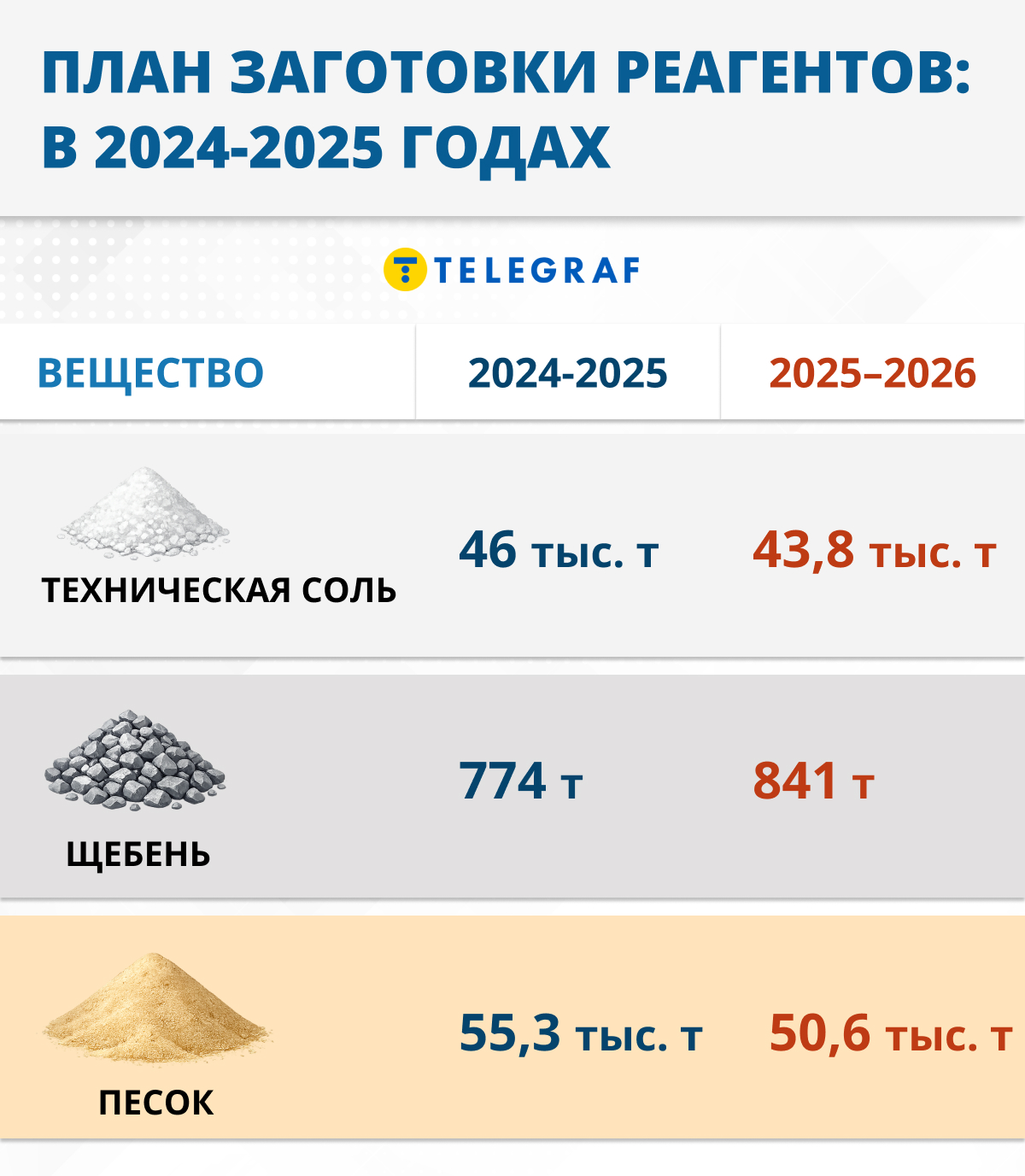 • в 2025-2026 годах: 43,8 тыс. т технической соли, 841 т щебня и 50,6 тыс. т песка.