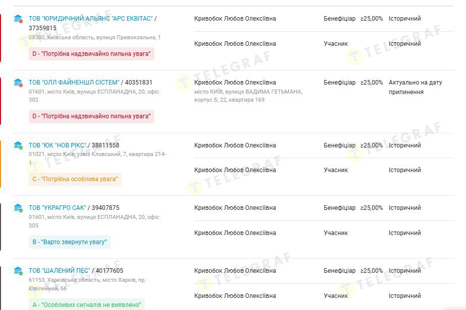Любовь Кривобок, по данным аналитической системы YouControl, имела отношение к нескольким бизнес-проектам. В частности, была среди владельцев ООО "Олл Файненшл Систем", которое занималось предоставлением финансовых услуг. В настоящее время деятельность этой фирмы приостановлена. Также киевлянка числились в бенефициарах ООО "Безумный пес", работавшему в сфере общественного питания. Кроме того, Любовь Алексеевна – основательница ООО "Юридическая компания "Студия права", а эта фирма была среди владельцев ООО "Украгро Сак" (деятельность — оценка рисков и нанесенного ущерба) и "Юридический альянс "АРС Эквитас".