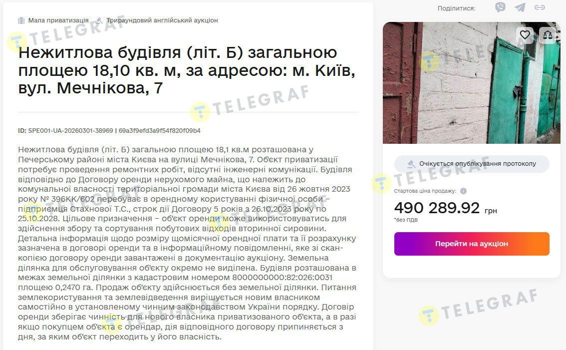 На продажу мусоросборники и здания общественного назначения в Печерском районе – на улицах Мечникова, Леонида Первомайского и бульваре Леси Украинки – были выставлены в рамках малой приватизации. Все три объекта расположены недалеко от станции метро Кловская и имеют примерно одинаковую площадь и характеристики – фактически это сараи в не очень хорошем состоянии и без инженерных коммуникаций.