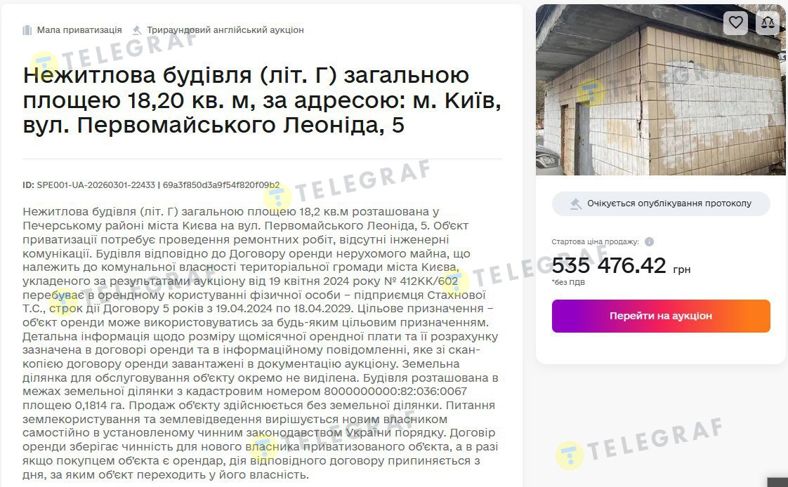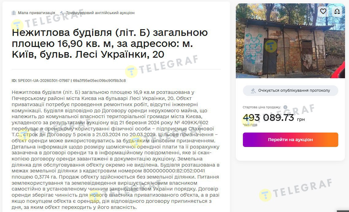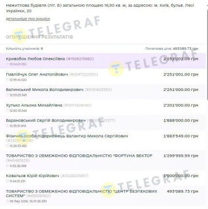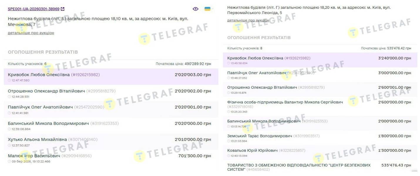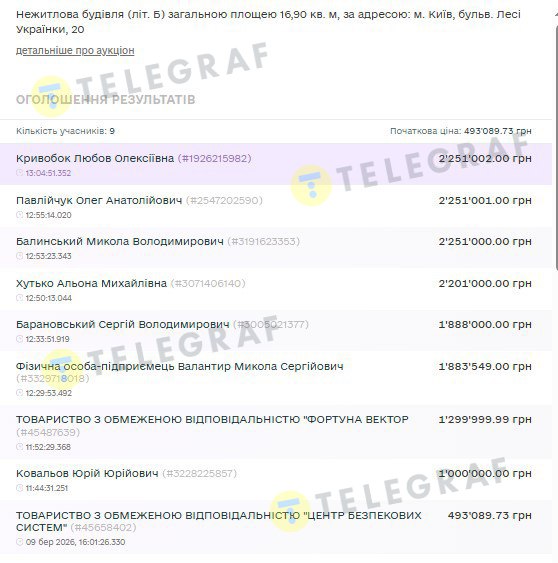 Несмотря на невзрачный вид недвижимости, за каждый лот билось по несколько участников. За уже упомянутую постройку (лит. Б) по бул. Леси Украинки, 20 – шесть частных лиц, одно физическое лицо-предприниматель и две ООО. Уже в первом раунде ставки значительно превысили начальную цену 493 тыс.грн. А победило предложение в 2,2 млн грн, что в 4,5 раза дороже стартовой стоимости. Сделала его и соответственно победила в аукционе киевлянка Любовь Кривобок.
