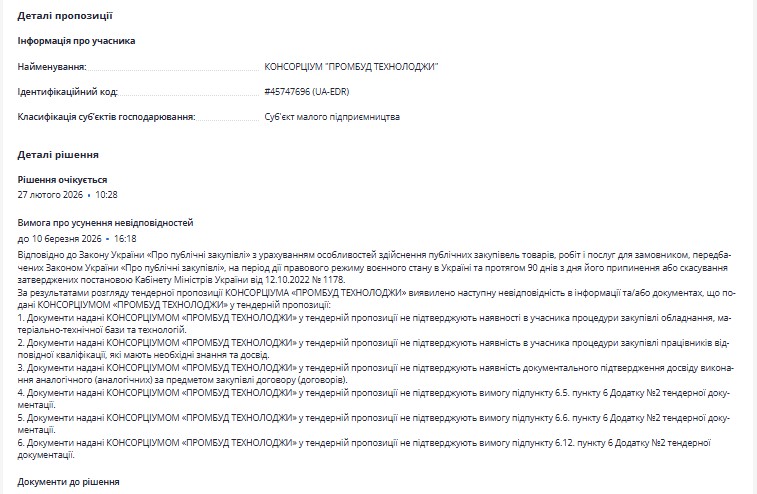 Ключевая проблема – фирма не доказала свою возможность выполнить сложные строительные работы, о чем свидетельствует сообщение в системе Prozorro. Согласно Закону Украины "О публичных закупках" и постановлению Кабмина №1178 заказчик, в этом случае КП "Дирекция строительства дорожно-транспортных сооружений г. Киева", обязан требовать подтверждения квалификации. У консорциума "провал" по всем ключевым пунктам, ведь предоставленные документы не подтверждают:
