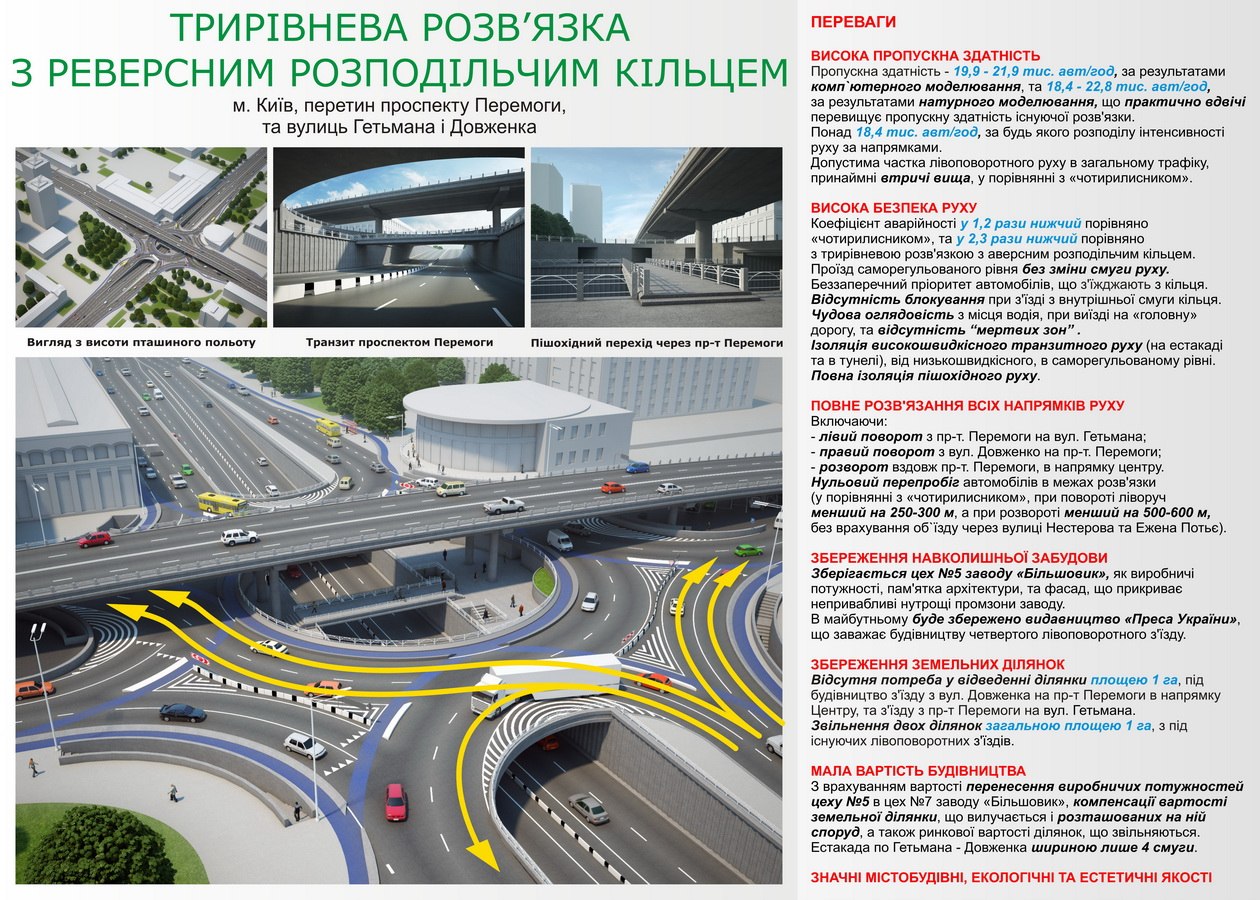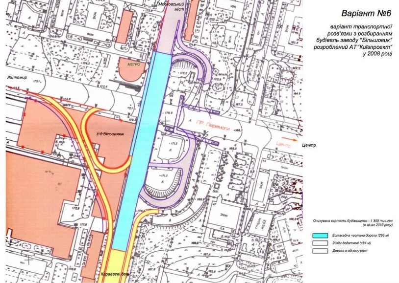 В пользу такого варианта в КГГА называли такие аргументы – скорость и дешевизна реализации. Это при том, что проект предусматривал снос цеха №5 Первого киевского машиностроительного завода (бывшего "Большевика"), который находился в частной собственности. Начальная цена обновления развязки составляла 598,5 млн грн.