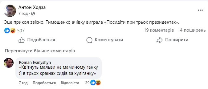 Информация о том, что Тимошенко снова занялись правоохранителями, быстро распространилась по сети. Шутят, что она выиграла "ачивку" (виртуальную награду, значок или достижение за выполнение определенных действий, чаще всего в видеоиграх, мобильных приложениях) "посидеть при трех президентах".