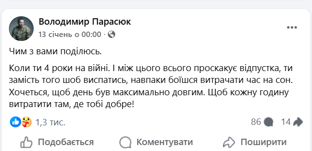 Так, последний пост в его Facebook датирован 13 января 2026 года. В нем он поделился мыслями относительно отпуска.
