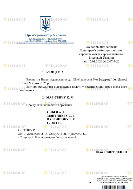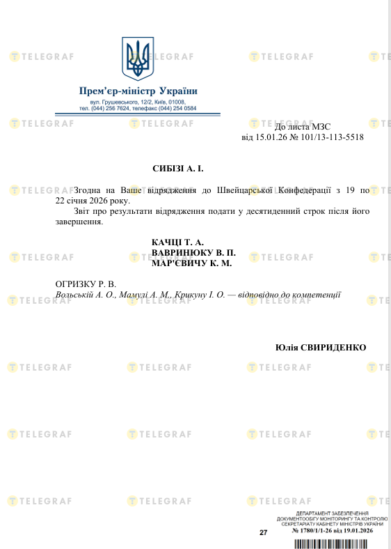 Как отмечено в ответе Секретариата Кабинета Министров, Премьер-министр Украины согласовала заграничную командировку в Швейцарскую Конфедерацию для участия в 56-м Ежегодном заседании Всемирного экономического форума следующим должностным лицам: