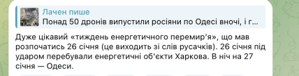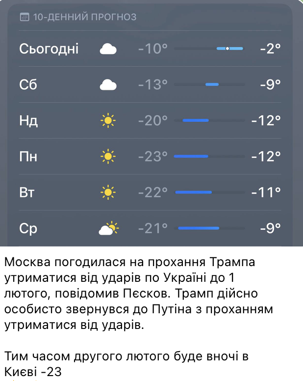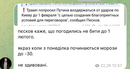 Блогер Игорь Лаченков отметил: "Москва согласилась по просьбе Трампа воздержаться от ударов по Украине до 1 февраля, сообщил Песков. Трамп действительно лично обратился к Путину с просьбой воздержаться от ударов. Тем временем второго февраля будет ночью в Киеве -23 градуса".