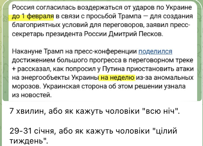 В пятницу, 30 января, Кремль согласился воздержаться от ударов по Украине до 1 февраля в рамках "энергетического перемирия". Чтобы создать благоприятные условия для переговоров.