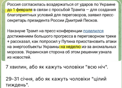 Украинский политтехнолог Александр Нойнец подчеркнул: "7 минут, или как говорят мужчины "всю ночь". 29-31 января, или как говорят мужчины "целую неделю".