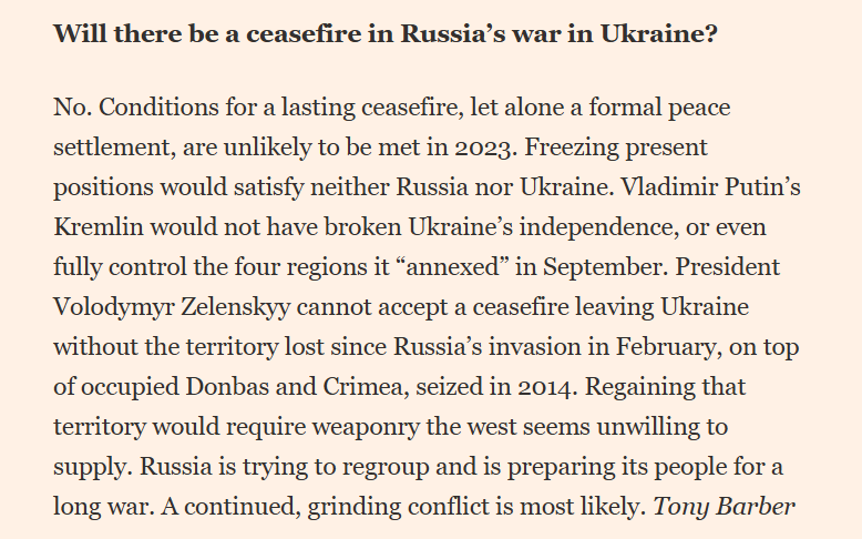 Тони Барбер, эксперт по европейской геополитике, прогнозировал, что боевые действия будут продолжаться на протяжении всего 2023 года, так как условий для устойчивого перемирия не существует. Издание отмечало, что Запад оказывает помощь осторожно и не всегда в тех объемах, которые позволили бы Украине быстро деоккупировать территории.