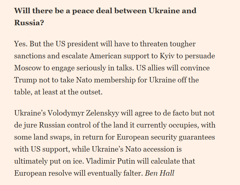 30 декабря 2024 года Financial Times опубликовала стратегический прогноз: в 2025 году возможно заключение мирного соглашения между Украиной и Россией.