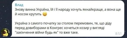 • Снова виновата Украина, ей и ее народу хотят как лучше, а она носом крутит. Украина с самого начала за столом переговоров, то, что деду перед довыборами в Конгресс хочется иметь козырь в виде "окончания войны как-нибудь" это уже такое.