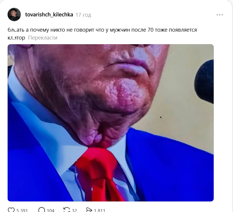 Пользовательница tovarishch_kilechka выложила в соцсети Threads фрагмент фото с шеей Трампа. Она обратила внимание, что эта часть тела 79-летнего политика напоминает женские половые органы. А вот в комментариях не все с ней согласились.