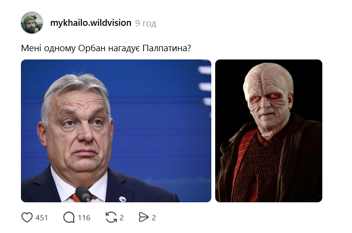 Так, в соцсети Threads пользователь mykhailo.wildvision, опубликовал фотоколлаж с Орбаном и персонажем саги "Звездные войны" Палпатином.