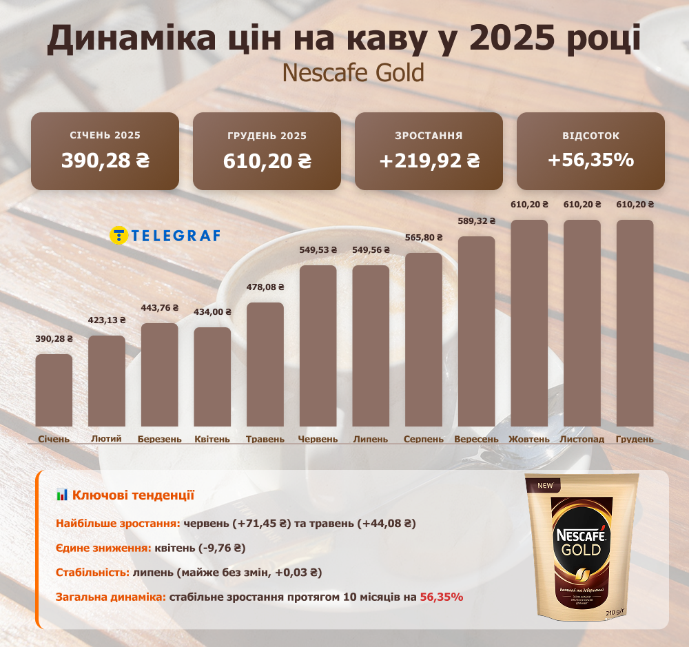 - Январь 2025: Упаковка кофе 210 г стоила около 390 грн.