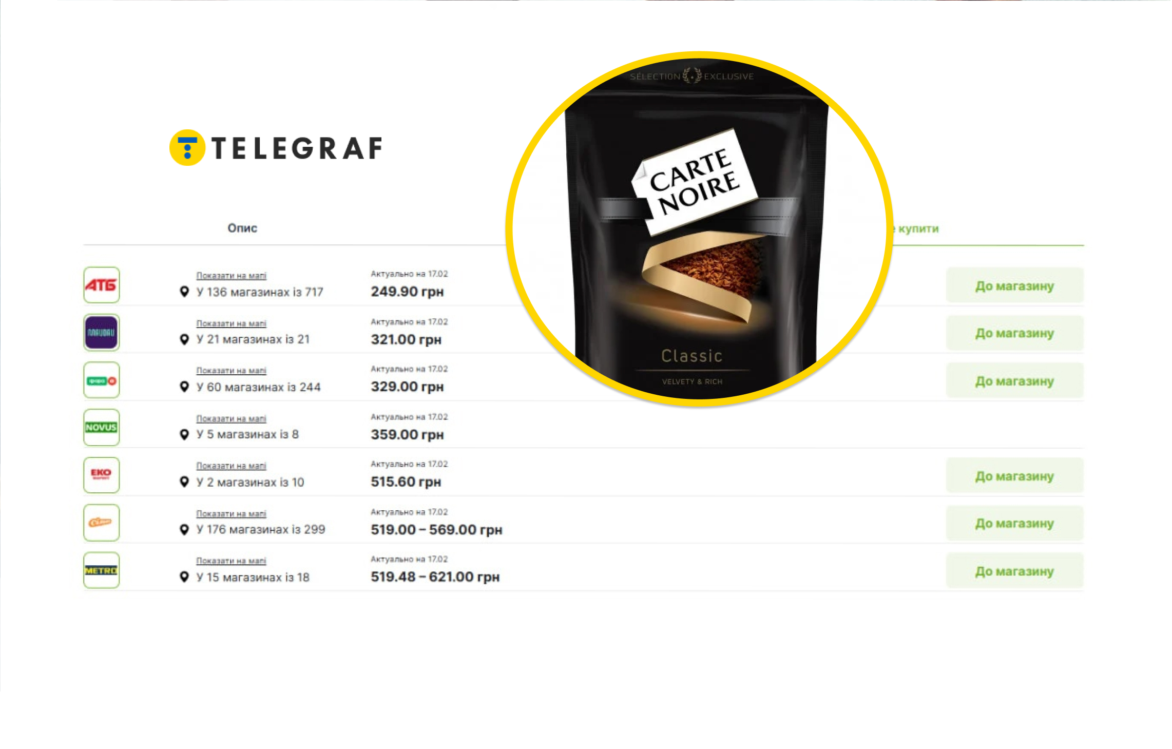 По данным "GoToShop", самая низкая цена на кофе от Carte Noire зафиксирована именно в сети "АТБ". Подробнее об этом написал "Телеграф".