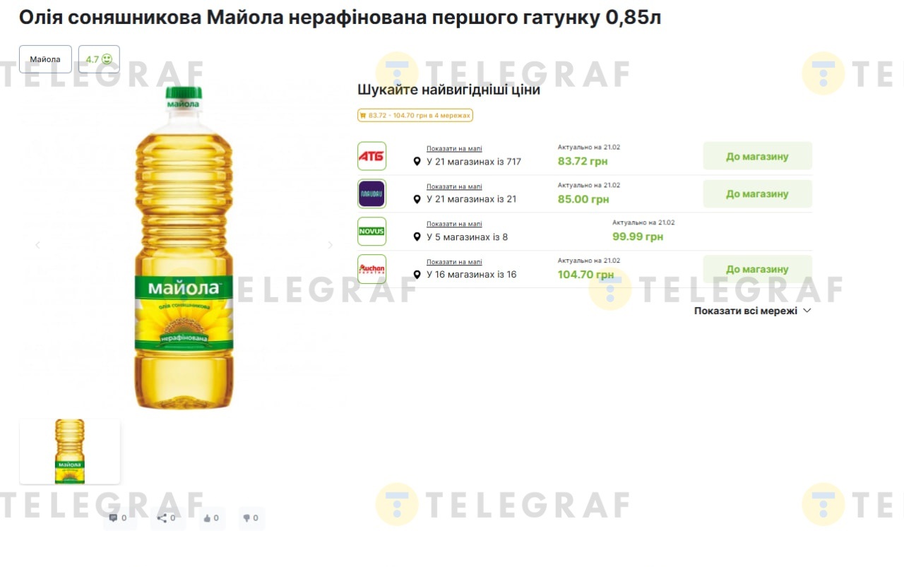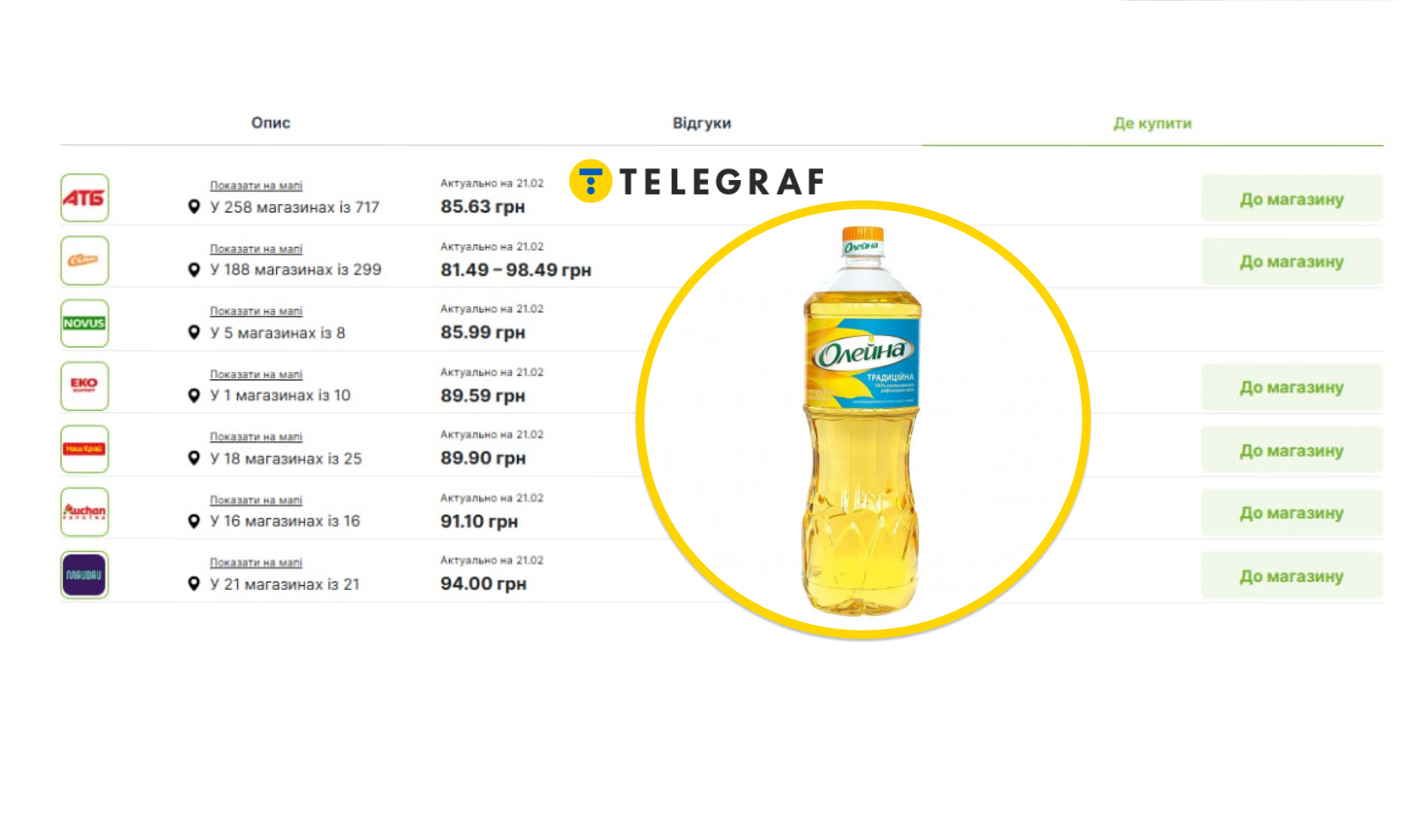 "Телеграф" узнал, сколько можно сэкономить на бутылке масла "Олейна" и "Майола" в этом магазине и какая на них цена в других супермаркетах. Данные взяли из "GoToShop".