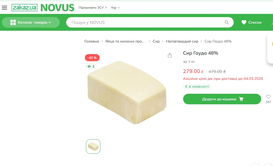 Немецкий сыр Гауда Zijerveld жирностью 48% сейчас можно приобрести за 279 гривен вместо 479 гривен за 1 килограмм. Таким образом скидка составляет 42%. Акционная цена действует при доставке по 4 марта 2026 года.