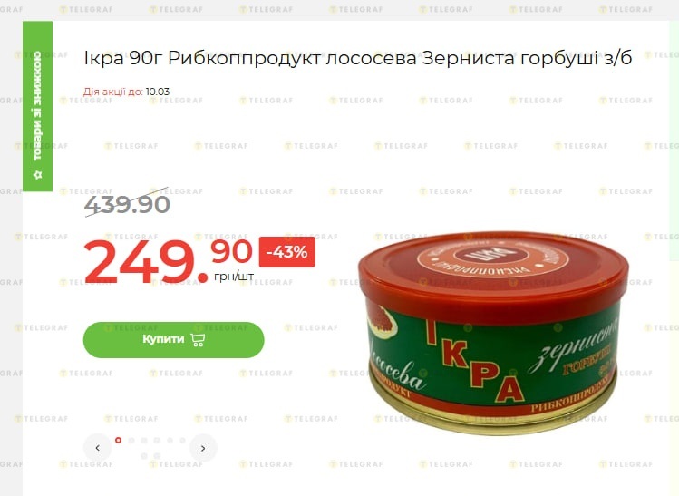 Речь идет о баночке икры лососевой зернистой горбуши от "Рыбкопродукт", которую можно приобрести со скидкой 43%. Ранее продукт стоил 439,90 гривны, а сейчас его можно купить всего за 249,90 гривны. Экономия составит 190 гривен.