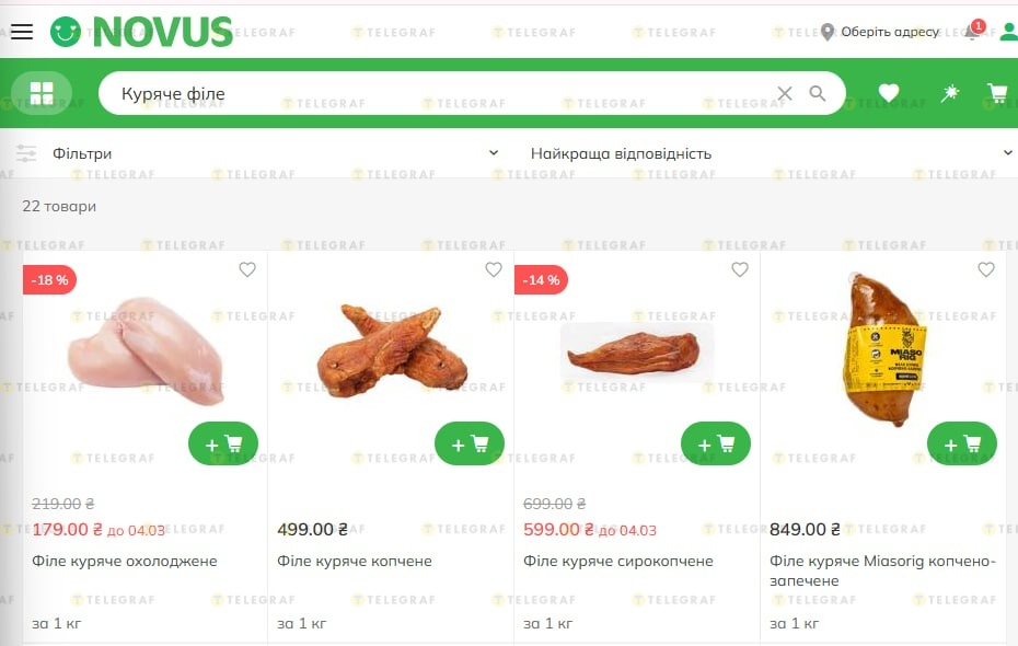 Самое дешевое предложение можно найти в "Novus": килограмм филе продают за 179 грн со скидкой, тогда как обычная цена составляет 219 грн.