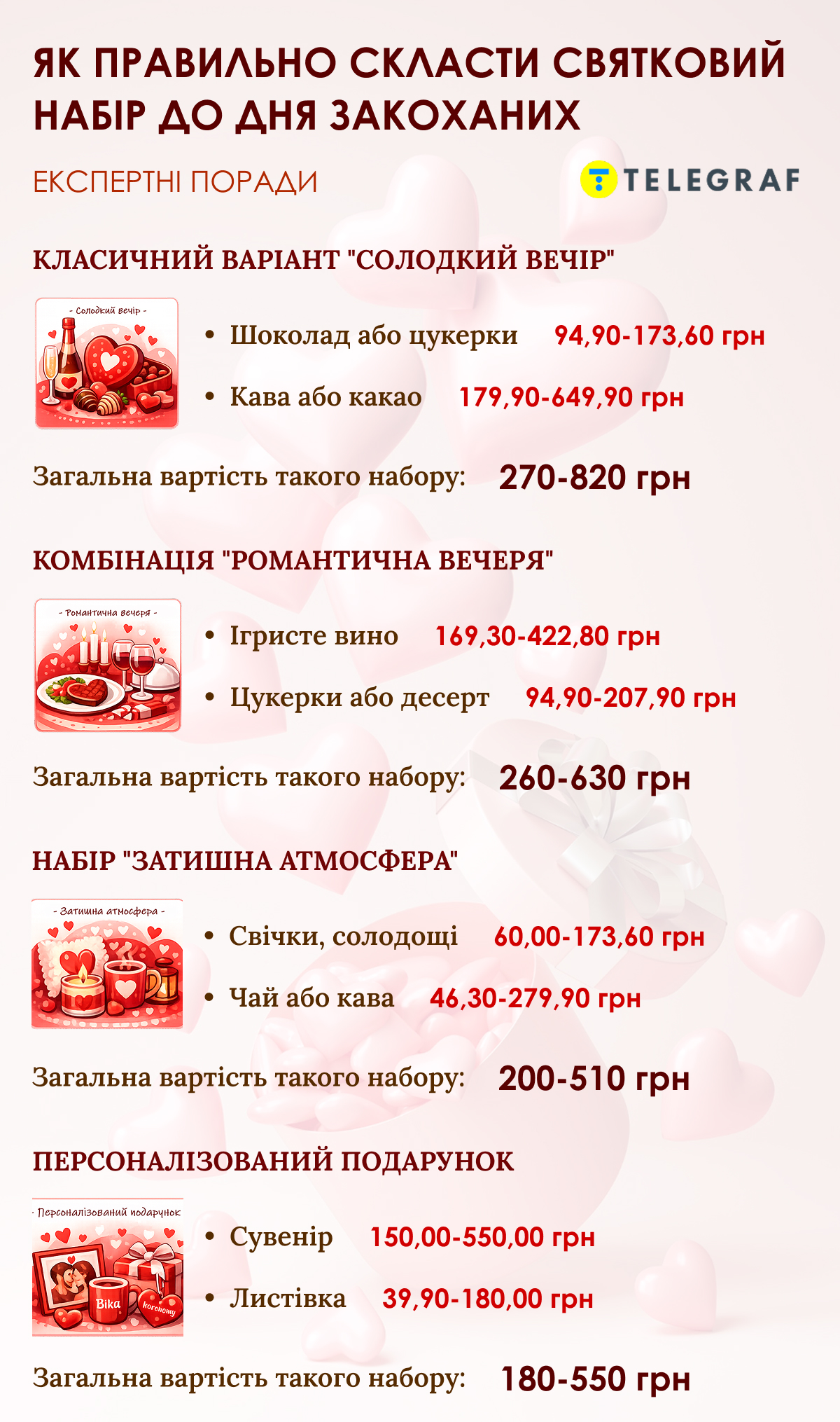 Набор "Уютная атмосфера" состоит из свечей (от 59,90 грн), сладостей (94,90-173,60 грн) и чая или кофе (46,30-279,90 грн). Такой вариант обойдется в 200–510 гривен. Персонализированный подарок может включать в себя небольшой сувенир (от 39,90 гривны), открытку, сладкий презент и напиток – общая стоимость от 180 до 550 гривен в зависимости от выбранных позиций.