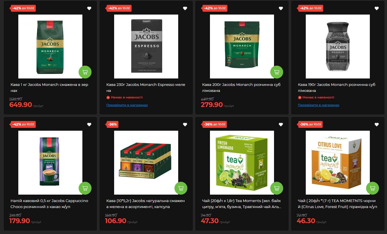 Кофе Jacobs Monarch в зернах (1 килограмм) доступен за 649,90 гривны вместо 1135,90 – скидка 42% действует до 10 февраля. Растворимый сублимированный кофе Jacobs весом 200 грамм стоит 279,90 гривны со скидкой 42%, а капучино Jacobs Cappuccino Choco (0,5 килограмма) – 179,90 гривны вместо 310,80.