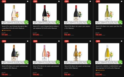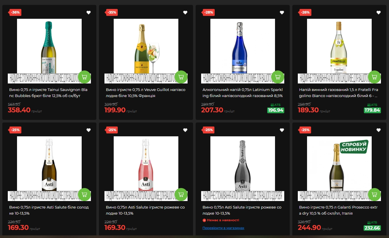 Для поклонников игристых напитков есть вино Veuve Guillot (Франция, полусладкое белое) за 199,90 гривны вместо 309,90 (скидка 35%), итальянское Asti Salute за 169,30 гривны со скидкой 25% и Galanti Prosecco (скидка 25%). Премиальные позиции включают Martini Asti DOCG за 595 гривен и Mionetto Prosecco за 422,80 грн.
