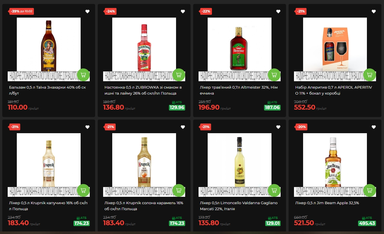 Ликеры и настойки тоже представлены с хорошими скидками: Becherovka Original (0,5 литра) стоит 306,30 гривны со скидкой 20%, Jim Beam Apple – 521,50 гривны (скидка 20%), итальянский Limoncello – 132,80 гривны. Для тех, кто хочет добавить алкогольный акцент к ужину, бальзам "Тайна Знахарки" продается за 110 гривен вместо 181,90 (скидка 39%).