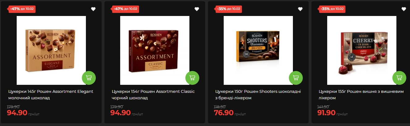 Премиум-варианты включают конфеты Raffaello весом 80 граммов за 106,90 гривны (скидка 7%), бельгийские конфеты De Luxe Selected Морские Сокровища (250 граммов за 165,50 гривны со скидкой 18%) коктейлей (200 граммов за 173,60 гривны, скидка 26%). Все эти позиции идеально подходят для тех, кто желает произвести впечатление качественным подарком.