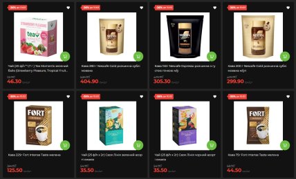 Чай Tea Moments в пирамидках (20 пакетиков) продается за 46,30-47,30 гривны со скидкой 36% – есть варианты с цитрусом, мятой, клубникой и тропическими фруктами. Ароматические свечи в стеклянных подсвечниках стоят от 59,90 до 149,90 грн в зависимости от размера и дизайна, есть даже декоративные свечи в форме сердца за 39,90 грн.