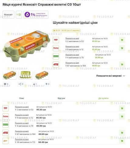Самую низкую цену на яйца этой марки предлагает сеть "ЭКО Маркет" — примерно 85,30 грн за упаковку. Почти такую же стоимость можно найти в супермаркетах "Auchan", где десяток яиц продают примерно за 85,40 грн.