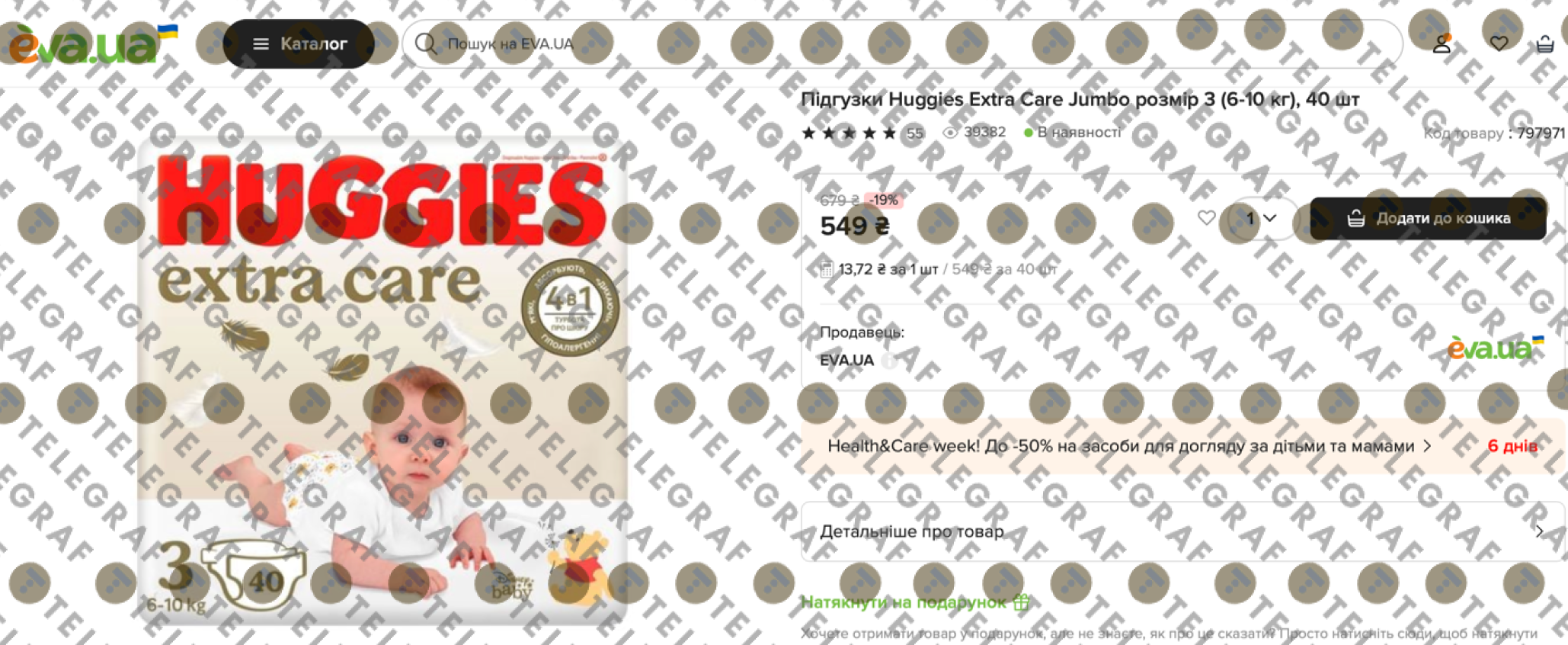 Среднюю позицию занимает магазин " EVA", где пачка Huggies Extra Care 3 стоит 549,00 грн.