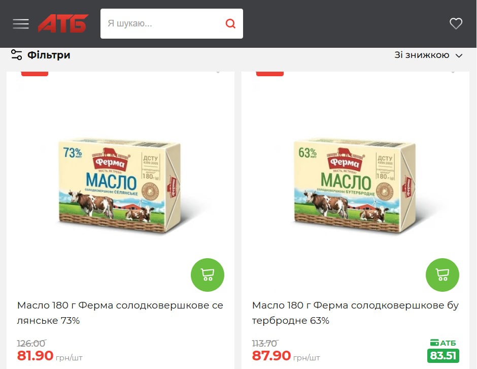 В частности, масло 180 граммов "Ферма" сладкосливочное селянское 73% теперь можно купить за 81,90 гривны вместо привычных 126,0 гривны — это экономия 35%.