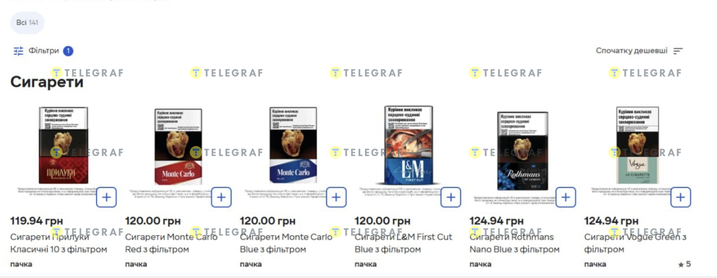 В "Сільпо" есть сигареты по 119,94 грн — Прилуки Классические 10 с фильтром. Пачка Monte Carlo Red стоит 120 грн, L&M First Cut — 120 грн, а Rothmans Nanо с фильтром — 124,94 грн.