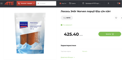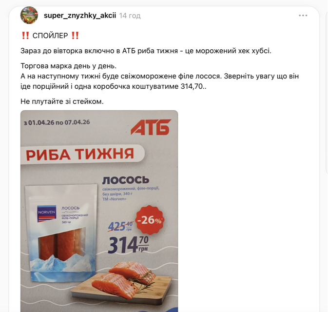 Пользователь super_znyzhky_akcii пишет, что акционный период якобы продлится с 1 по 7 апреля, а скидка распространяется на свежемороженый лосось (филе-порции без кожи) от торговой марки "Norven".