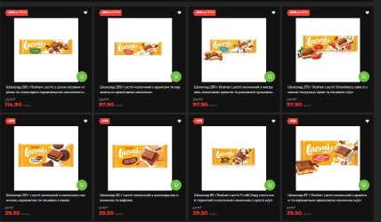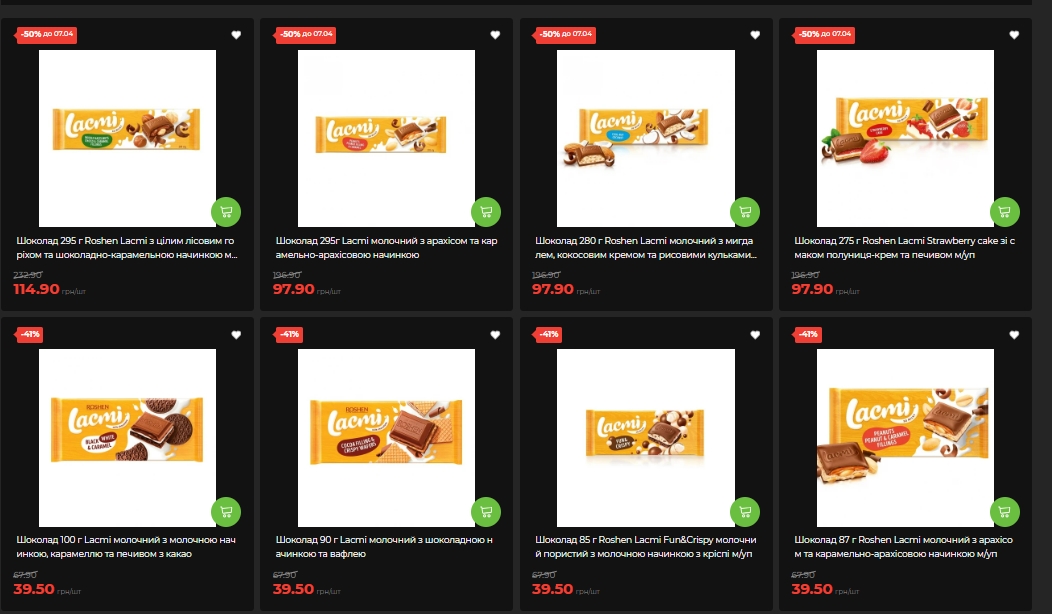 Шоколад Roshen Lacmi большой формат (275-295 г) — минус 50%, цены от 97,90 до 114,90 грн. Более мелкие плитки Lacmi (85–100 г) — минус 41%. Шоколад Millennium (белый, молочный, черный) – минус 40%. KitKat и Nesquik – минус 35%. Крекеры Roshen 2 Crack – минус 34%. Печенье Oreo 176 г – минус 33%.