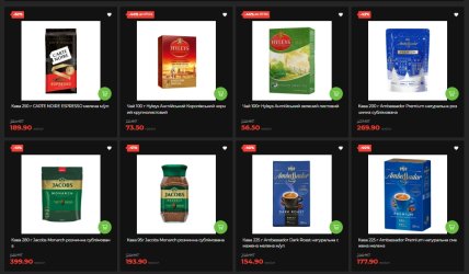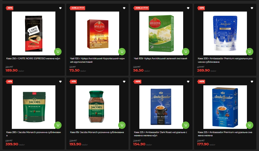 Самая громкая скидка недели среди напитков — кофе CARTE NOIRE ESPRESSO молотый 250 г: минус 50%, 189,90 грн вместо 384,50. Jacobs Monarch растворимый 280 г и 95 г – минус 41%. Ambassador Premium растворимая 200 г — минус 43%, 269,90 грн. Nescafe Gold 200 г и 280 г — минус 35%.
