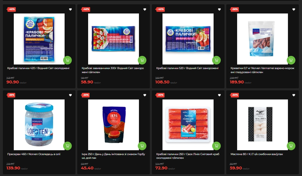 Крабовые палочки от "Водного Мира" — три разных формата со скидкой 40%. Охлажденные 420 г – 90,90 грн вместо 153,90. Замороженные 520 г – 108,50 грн вместо 180,90. Креветки Norven Vannamei (700 г) подешевели на 36% — с 299,90 до 189,90 грн. Пресервы "Norven Селедка в масле" — минус 35%, 139,90 грн. Икра "Norven" лососевая (90 г) — минус 30%, 349 грн.