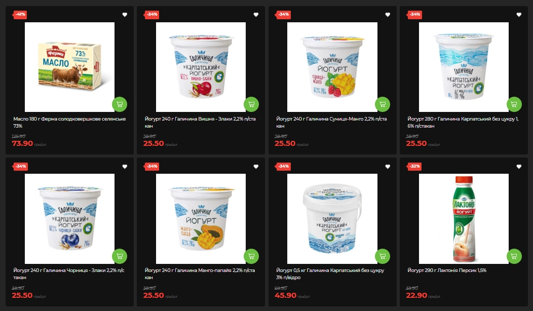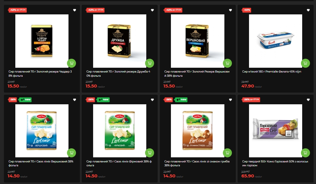 Среди молочных продуктов больше всего "упало" масло: "Ферма" сладкосливочное 73% — минус 41%, от 125,90 до 73,90 грн. Плавленые сыры "Золотой резерв" (Чеддер, Дружба, Сливочный) продают со скидкой 43% — по 15,50 грн вместо 27,50, но только до 7 апреля. Твердые сыры "Комо" — Ореховый, Сливочный, Чеддер и Сметанковый — подешевели на 36%, также до 7 апреля.