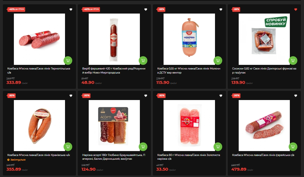 Колбаса "Тернопольская" (с/у) от "Мясной лавки" — минус 40%, до 333,89 грн/кг. Изделие фаршевое "Ново-Миргородская" от "Колбасного ряда" — тоже 40%, 48,90 грн за штуку вместо 81,60. Колбаса "Молочная" ДСТУ дешевле на 35%, сосиски "Докторские" — также на 35%. Сервелат "Добров" и балык "Праздничный" — минус 30%.